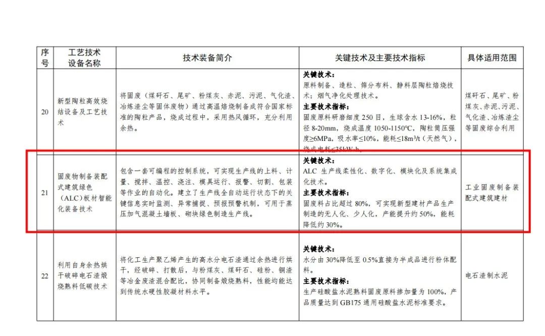天意機(jī)械主導(dǎo)產(chǎn)品包括輕質(zhì)墻板智能裝備、PC智能裝備、蒸壓加氣混凝土(ALC)板材智能裝備、保溫裝飾一體化板智能裝備等系列。設(shè)備均以固廢物利用為研發(fā)條件,不斷進(jìn)行設(shè)備及配方的更新。此次入選目錄的是ALC板材智能裝備,該設(shè)備關(guān)鍵技術(shù)涉及ALC生產(chǎn)線柔性化、數(shù)字化、模塊化及系統(tǒng)集成化技術(shù)。該生產(chǎn)線固廢料占比超過80%,可實(shí)現(xiàn)新型建材產(chǎn)品生產(chǎn)制造的無人化、少人化,產(chǎn)能提升約50%,能耗降低約30%。