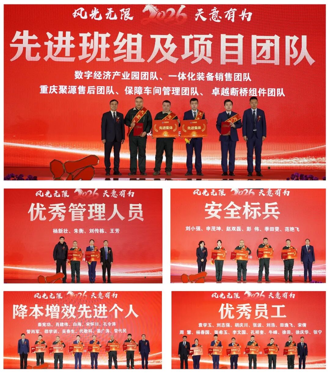 星光不負(fù)趕路人,時(shí)光不負(fù)實(shí)干者。2025年集團(tuán)涌現(xiàn)出大批愛(ài)崗敬業(yè)、實(shí)績(jī)突出的優(yōu)秀個(gè)人與集體,成為全體天意人學(xué)習(xí)的榜樣。常務(wù)副總蘇冬青宣讀表彰決定,優(yōu)秀員工、降本增效先進(jìn)個(gè)人、安全標(biāo)兵、優(yōu)秀管理人員、先進(jìn)班組等榮譽(yù)依次頒發(fā),獲獎(jiǎng)代表登臺(tái)領(lǐng)獎(jiǎng),現(xiàn)場(chǎng)掌聲雷動(dòng)。