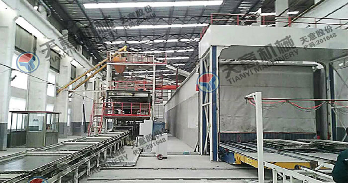多功能墻板生產線,可生產“三明治”夾芯板,鋼邊框屋面板、樓面板,不帶面板復合板。生產線主要分為自動配料系統(tǒng)、攪拌系統(tǒng)、發(fā)泡系統(tǒng)、中央控制配電系統(tǒng)、輕質混凝土布料系統(tǒng)、磨光系統(tǒng)、模具循環(huán)系統(tǒng)、養(yǎng)護系統(tǒng)、碼垛系統(tǒng)等部分組成。