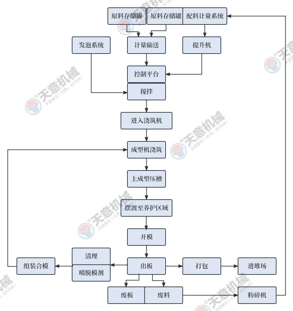 設備特點 TYF-01型立式復合墻板生產線,設備占地面積小,產品一次成型,產量高。主機配有自動行走系統,設備運轉更簡單快捷,大型固定式攪拌設備,攪拌料漿更均勻,澆注效率更高。 工藝流程